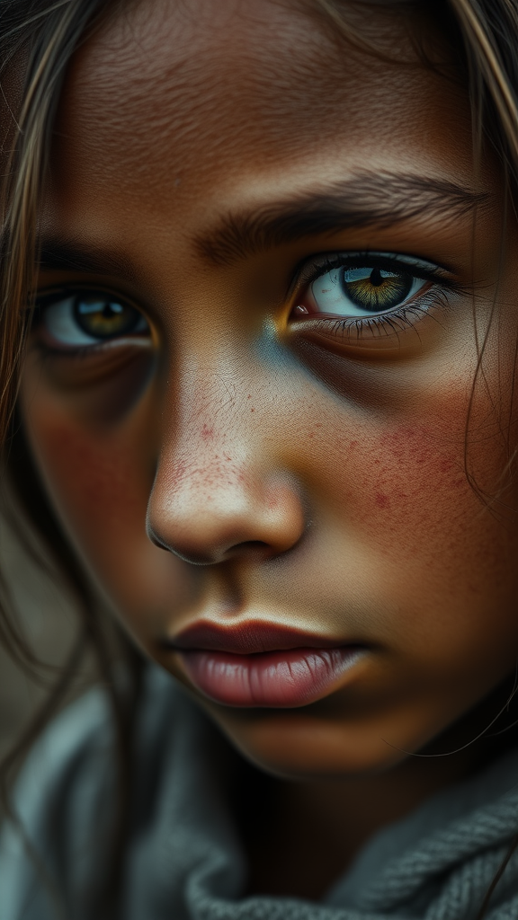 A hyperrealistic close-up portrait of a teen-aged girl with a timid and vulnerable expression, her skin a rich, earthy brown, reminiscent of fertile soil, adorned with delicate freckles. Her gaze is soft yet profound, embodying a quiet strength. The style merges the intricate, textured detail of charcoal art with the vivid intensity seen in Graham Humphreys' work, echoing the timeless essence captured by Albert Watson. Inspired by Antoni Pitxot's unique touch, the image serves as an evocative and epic album cover, conveying depth and beauty.