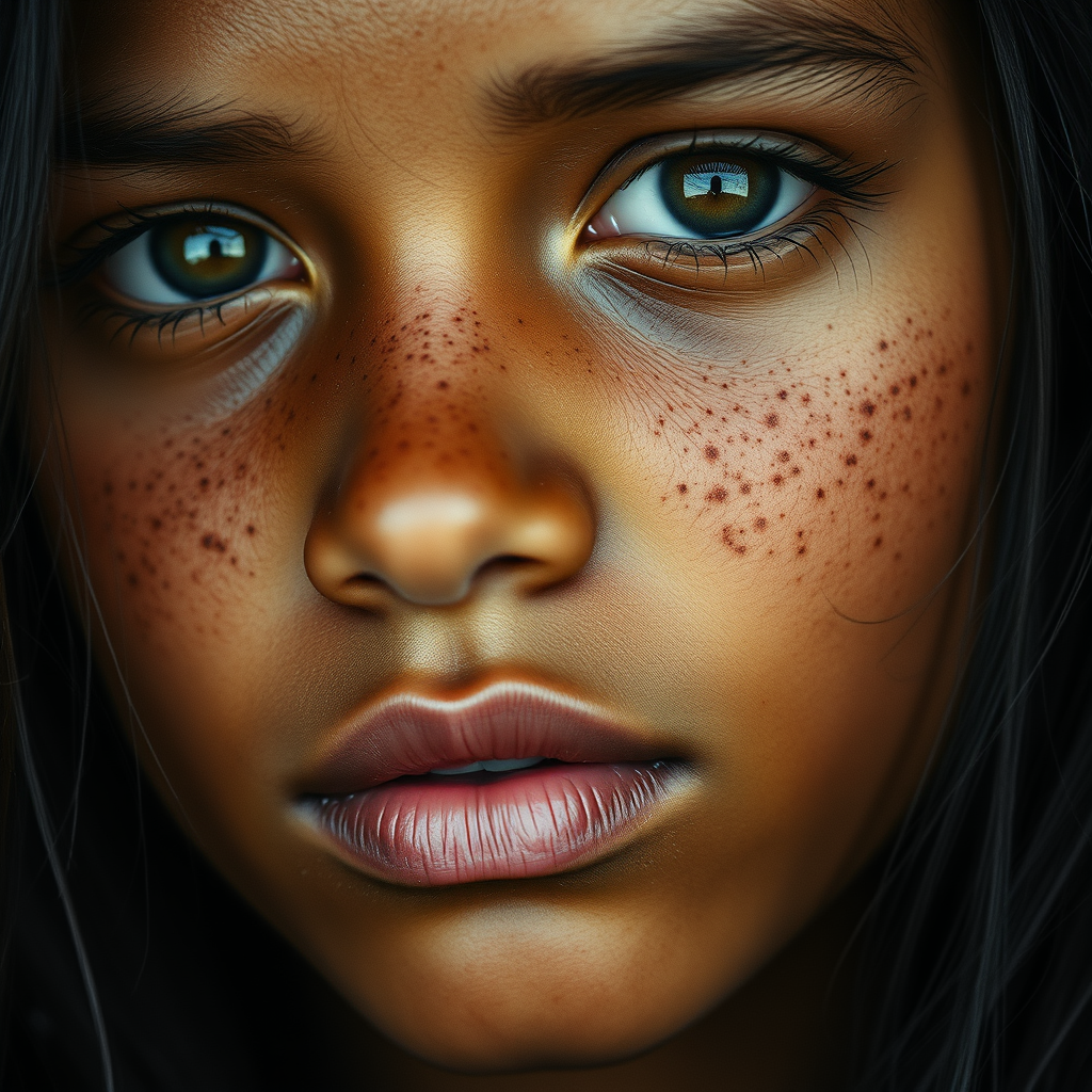 A hyperrealistic close-up portrait of a teenage girl with freckles scattered across her radiant brown skin, reminiscent of rich soil. The composition captures her timid and vulnerable expression, exuding both beauty and sensitivity. Inspired by the styles of Albert Watson and Antoni Pitxot, this image evokes the grandeur of an epic music album cover. The shading is smooth and delicate, akin to charcoal artwork. Her gaze is soft and introspective, blending human emotion with legendary artistry, resonating with the evocative flair of Graham Humphreys.
