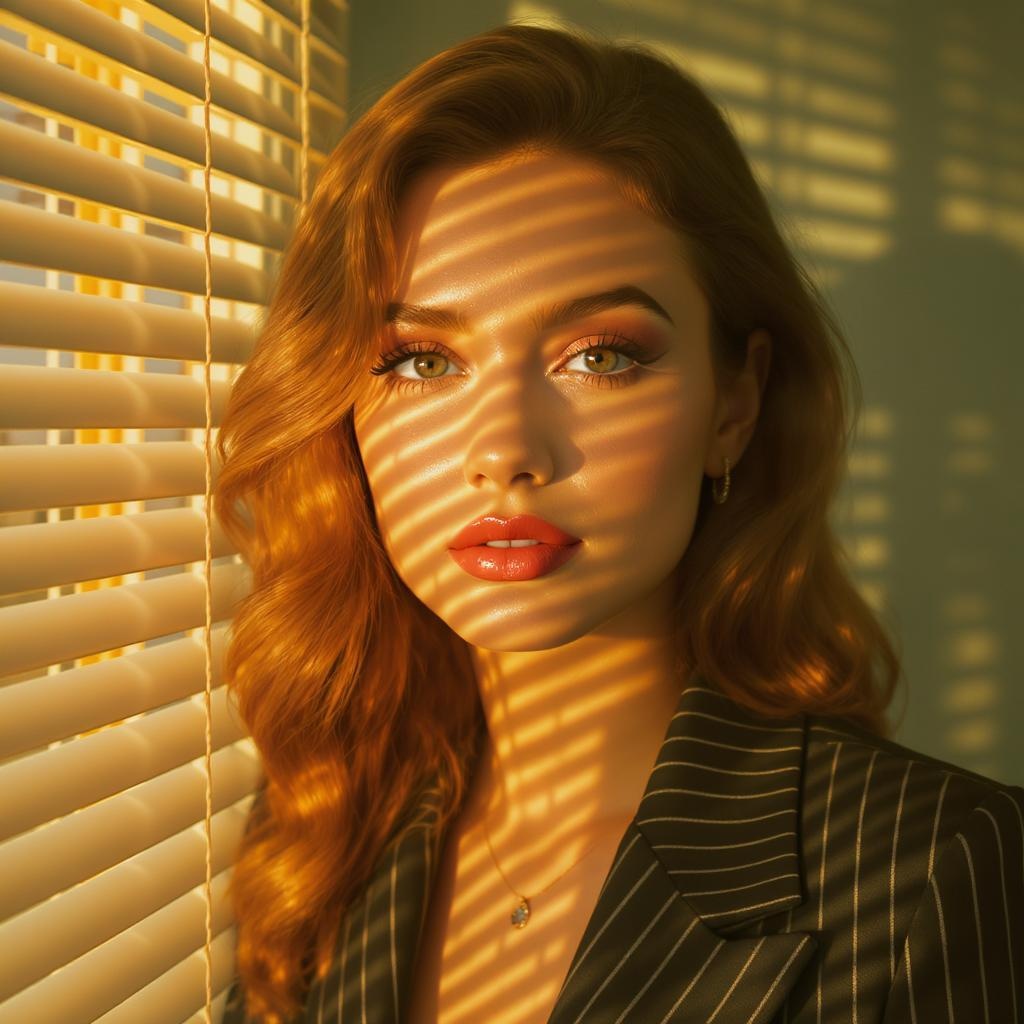 A hyperrealistic close-up portrait of a woman enveloped in warm, golden afternoon light pouring through vintage Venetian blinds, casting delicate shadow patterns across her face. The lighting accentuates her naturally radiant complexion, with a dewy finish that reveals subtle, lifelike textures. Her cheekbones are softly defined, her expressive eyes highlighted by long, graceful lashes, with a whisper of pastel eyeshadow adding depth. Her lips, painted in a gentle coral hue, enhance her graceful appearance. She wears a dark, pinstriped blazer, its meticulous details evident in the fabric, adding a touch of classic elegance. The background features a soft sage green wall, gently textured, complementing the scene’s warm, retro-inspired tones. The composition blends 1980s-inspired soft synthwave lighting with hyperrealistic detail, capturing each nuance—from the dance of light and shadow on her skin to the precise texture of her blazer. The aesthetic conveys a nostalgic yet refined mood, merging cinematic allure with contemporary hyperrealism.