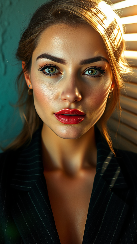 A hyperrealistic close-up portrait of a woman graced by soft, warm afternoon light seeping through vintage Venetian blinds, casting intricate shadow patterns across her face. The glow accentuates her naturally radiant complexion, with dewy skin that reveals fine, realistic textures. Her cheekbones are gently illuminated, her expressive eyes framed by long, delicate lashes, with a hint of pastel eyeshadow enhancing their depth. Her full lips, adorned in a soft coral shade, add warmth to her refined appearance. She is dressed in a dark, pinstriped blazer, with meticulous details visible in the fabric, providing a refined, timeless touch. The backdrop is a muted teal wall, subtly textured, complementing the scene's warm, retro-inspired tones. The composition combines 1980s-inspired soft synthwave lighting with hyperrealistic rendering, capturing every nuance—from the dance of light and shadow on her skin to the precise weave of her blazer fabric. The aesthetic evokes a nostalgic yet sophisticated mood, merging elements of cinematic elegance and modern hyperrealism.