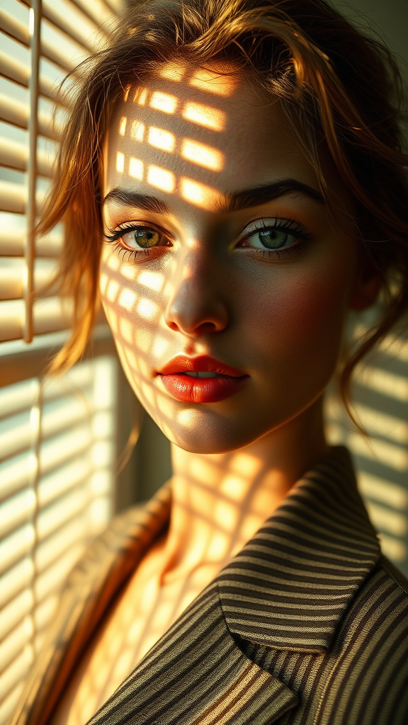 A hyperrealistic close-up portrait of a woman illuminated by soft, golden afternoon light filtering through vintage Venetian blinds, casting intricate shadow patterns on her face. This gentle lighting enhances her natural radiance, showing her fresh complexion with dewy skin that reveals subtle, realistic textures. Her cheekbones are softly defined, her expressive eyes accentuated by long, delicate lashes, while a hint of pastel eyeshadow adds depth to her gaze. Her lips, painted a soft coral shade, contribute warmth to her sophisticated aura. She wears a tailored, pinstriped blazer, its detailed fabric lending a timeless elegance. The background features a muted seafoam green wall, with subtle texture that complements the warm, retro-inspired hues of the scene. The composition blends 1980s-inspired synthwave lighting with hyperrealistic detail, capturing every nuance—from the dance of light and shadow on her skin to the intricate weave of her blazer. The aesthetic evokes a nostalgic yet refined mood, merging cinematic allure with contemporary hyperrealism.