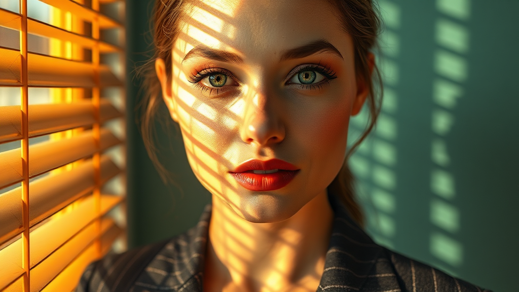 A hyperrealistic close-up portrait of a woman illuminated by warm, gentle afternoon light filtering through vintage Venetian blinds, casting intricate shadow patterns across her face. The lighting accentuates her naturally radiant complexion, highlighting realistic textures with dewy skin. Her cheekbones are subtly enhanced, and her expressive eyes, framed by long, delicate lashes, shimmer with a hint of pastel eyeshadow that adds depth and allure. Her full lips, tinted in a soft coral hue, impart a gentle warmth to her sophisticated appearance. She is dressed in a deep charcoal pinstriped blazer, with the fabric's intricate details and patterns clearly visible, adding an elegant, timeless touch. The backdrop is a muted teal wall, with a subtle texture that complements the warm, retro-inspired tones of the scene. The composition blends 1980s-inspired soft synthwave lighting with hyperrealistic rendering, meticulously capturing every element—from the delicate dance of light and shadow on her skin to the intricate weave of her blazer. The aesthetic exudes a nostalgic yet refined mood, merging the essence of cinematic glamour with contemporary hyperrealism.