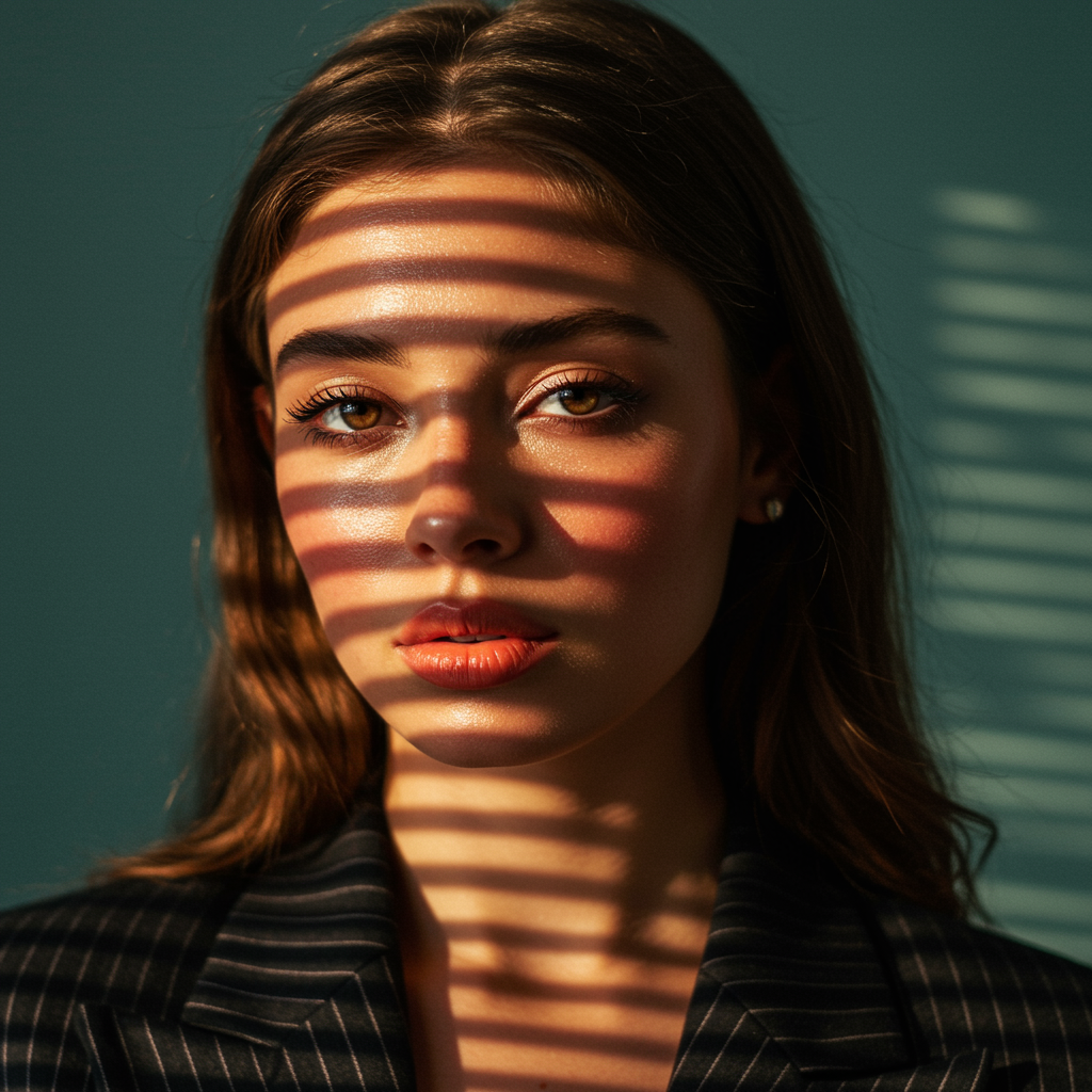 A hyperrealistic close-up portrait of a woman illuminated by the warm, gentle glow of late afternoon light filtering through vintage Venetian blinds, which casts intricate shadow patterns across her face. This lighting accentuates her natural, luminous complexion, with dewy skin featuring subtle, realistic textures. Her cheekbones are softly accented, enhancing her expressive eyes that are framed by long, delicate lashes, a hint of pastel eyeshadow adding depth to her gaze. Her full lips, coated in a soft coral hue, exude warmth, enhancing her graceful demeanor. She is adorned in a tailored, dark pinstriped blazer, with the fabric's precise details providing a refined and timeless feel. The backdrop is a muted teal wall with a subtle texture, complementing the warm, retro-inspired tones that fill the scene. The entire composition marries 1980s-inspired soft synthwave lighting with hyperrealistic detail, capturing every aspect—from the dance of light and shadow on her skin to the defined weave of her blazer fabric. This aesthetic conjures a nostalgic yet sophisticated atmosphere, seamlessly integrating elements of cinematic elegance and contemporary hyperrealism.