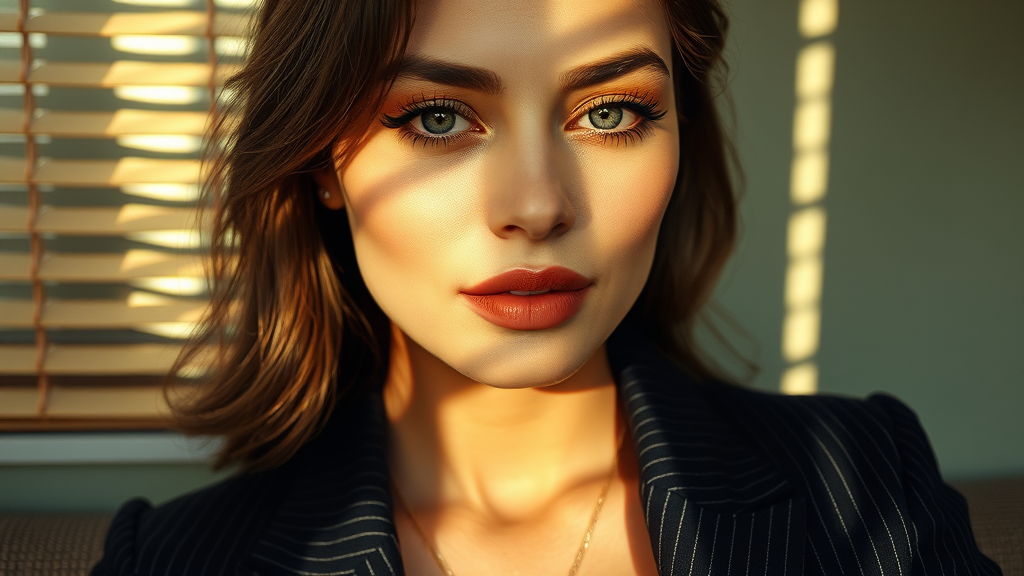 A hyperrealistic close-up portrait of a woman immersed in the gentle glow of afternoon light streaming through vintage Venetian blinds, casting intricate shadow patterns across her face. This soft lighting highlights her naturally radiant complexion, with a hint of dewiness revealing subtle textures. Her cheekbones are delicately accentuated, and her expressive eyes are framed by long, graceful lashes, with a subtle pastel eyeshadow adding depth. Her full lips, adorned with a soft coral shade, enhance her warm, elegant demeanor. She wears a deep navy pinstriped blazer, showcasing meticulous detailing in the fabric, lending a classic, timeless touch. Behind her, a muted sage green wall with a faint texture complements the warm, retro hues of the scene. The composition merges 1980s-inspired soft synthwave lighting with hyperrealistic detail, capturing every nuance—from the dance of light and shadow on her skin to the intricate weave of her blazer fabric. This aesthetic evokes a nostalgic yet refined mood, seamlessly blending cinematic allure with modern hyperrealism.