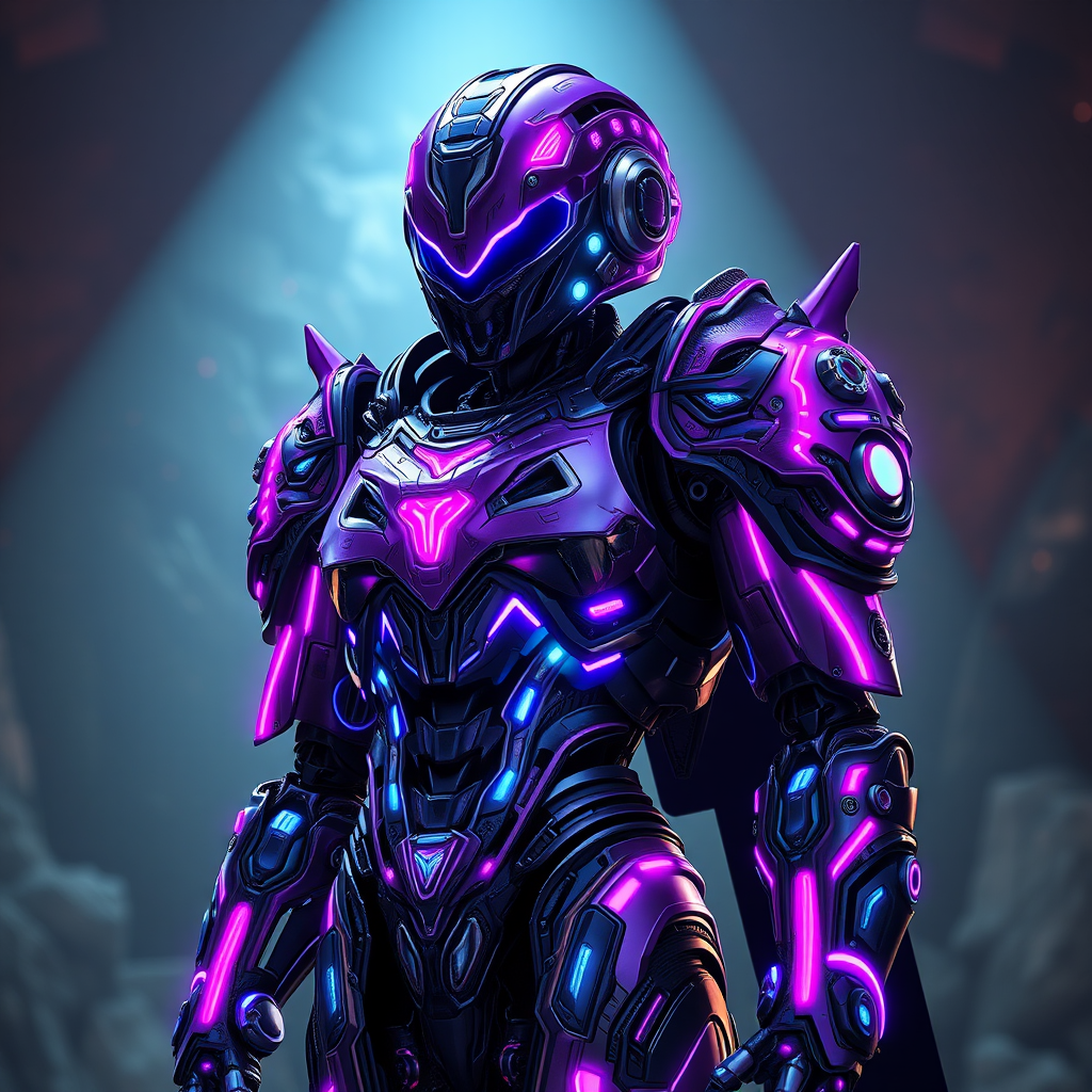 A hyperrealistic cyberpunk android with intricate purple and blue neon-infused armor, adorned with ornate designs, stands under cinematic lighting. The full-body depiction showcases high-definition detail, inspired by art trends on ArtStation. Utilizing Unreal Engine 5's capabilities, the focus is on showcasing the robot's elegant yet fierce design in a vivid, cinematic 4K resolution, with enhancements that emphasize its high-tech aesthetic, set against a richly textured backdrop.