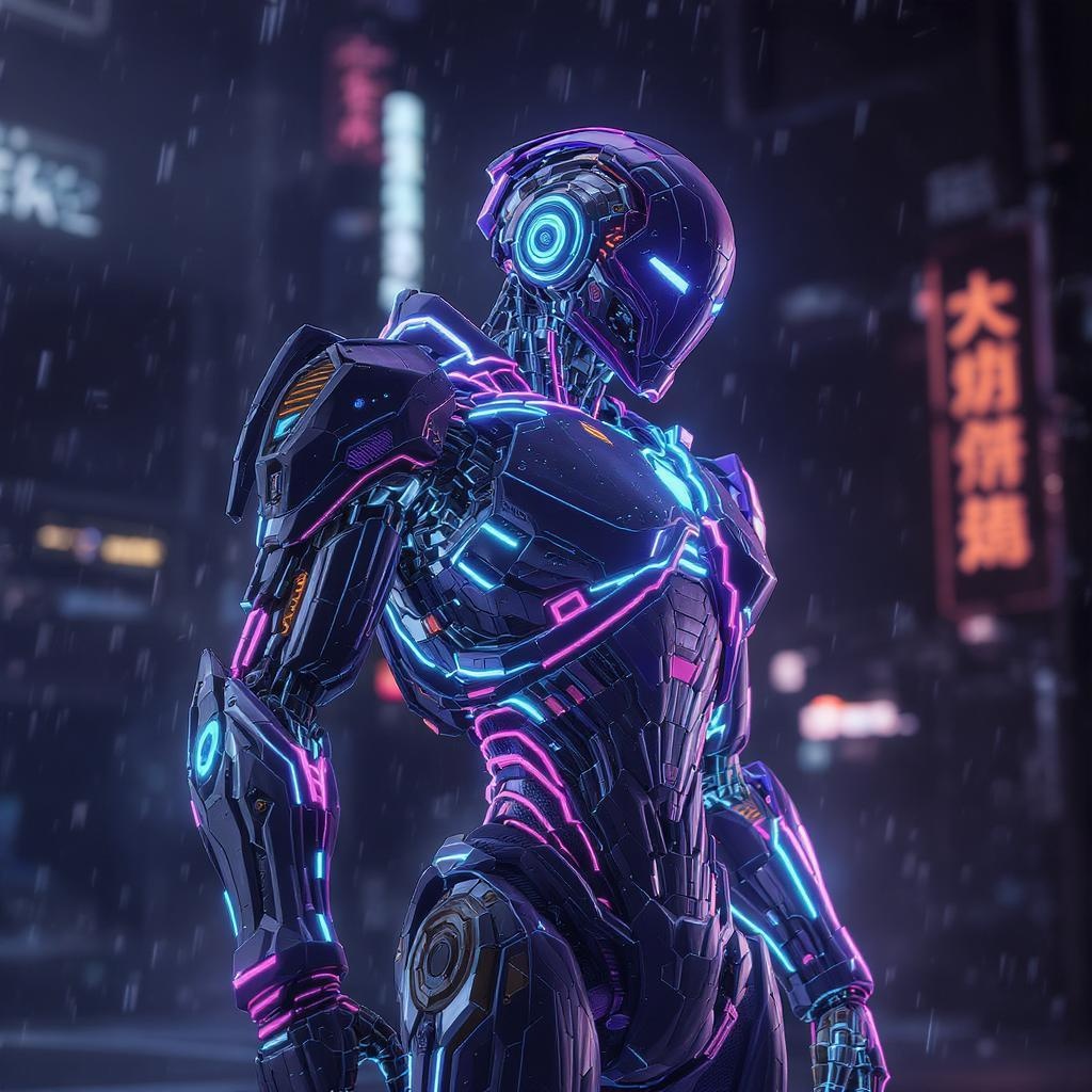 A hyperrealistic cyberpunk robot cloaked in intricate neon armor of purple and blue hues, showcasing a cinematic presence with ornate details and dramatic lighting. The full-body depiction captures every mechanical joint and panel with high detail, using ultra-realistic rendering to highlight textures and reflections. The scene, inspired by trending artworks on ArtStation, immerses the viewer in a focused and visually stunning environment, as though crafted with Unreal Engine 5. The robot stands in a 2:3 aspect ratio with an overall 4K resolution quality, retaining the essence of an advanced, futuristic world with subtle creative enhancements.