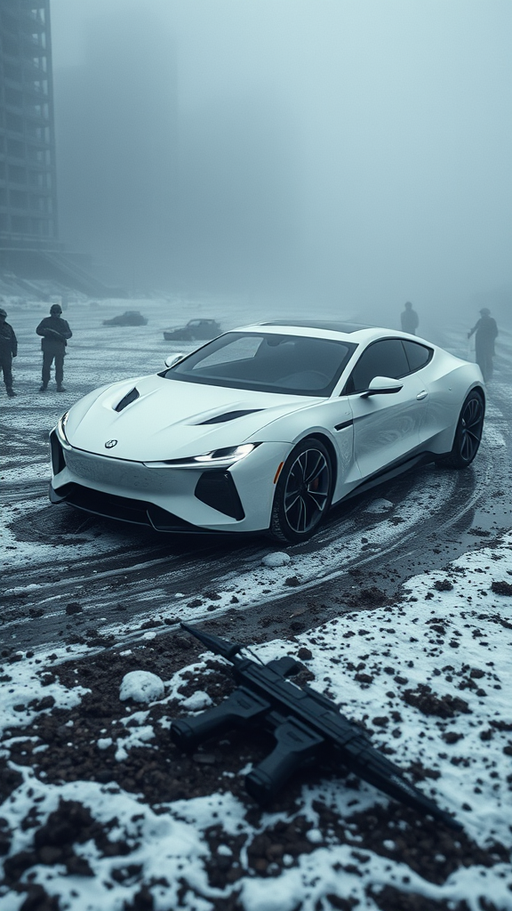 A hyperrealistic depiction of a futuristic utopian car with white paint, set against the backdrop of a desolate cityscape. The scene is captured in a reporter style, with high and low contrast elements, enveloped in a thick fog. Snow and mud are splattered around, creating a textured ground. The car's LED lights gleam, reflecting superb materials. The surroundings include soldiers scattered on the ground, viewed from a bird's-eye, drone-level angle, showcasing a top-level focal point. The image is captured in an analog style, emphasizing intricate details with a large depth of field. The creative aesthetic includes matte, detailed skin textures with soft lighting and subsurface scattering. Heavy shadows enhance the masterpiece quality of the image, rendered in 8k resolution with a focus on the golden ratio. The scene is complex, detailed, and framed in a film photography style, embodying an intricate, high-detail masterpiece.