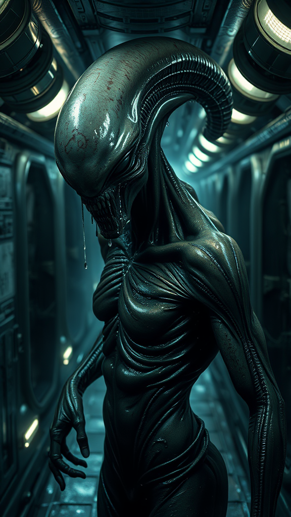A hyperrealistic depiction of a sinister alien creature, with intricate alien skin and garments, set against a moist, steamy, and highly detailed spaceship corridor. The scene is illuminated by flickering halogen lamps that cast shadows in muted, dark tones. The creature strikes an aggressive, sultry pose, showcasing a flawless, intricately detailed face and body. Its skin glistens with smudges and oil, adorned with alien tattoos and scars that tell tales of intergalactic journeys. Water droplets trickle down its highly detailed form, reflecting the eerie ambiance of the setting. The art draws inspiration from the dark, atmospheric elements of The Alien film franchise, exuding a photorealistic, masterful essence. The piece is further enhanced by the analog style of 8K UHD with RAW detailing, akin to an octane render. The artistry is reminiscent of HR Giger's and Jeremy Mann's unique approaches, with professional color grading and a muted LUT that adds depth. Amidst this alien elegance, a subtle hint of organic mutation is observed, with textures that evoke both intrigue and discomfort. The design creatively diverges with unique, yet harmonious modifications, maintaining the core eerie and captivating allure.