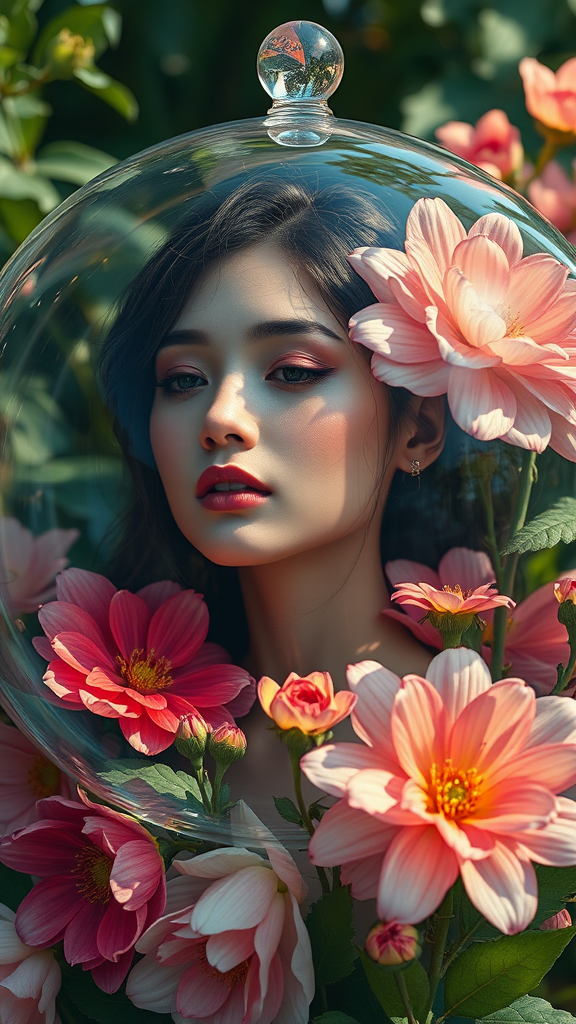 A hyperrealistic depiction of a woman encapsulated within a transparent glass sphere, surrounded by lush, intricately detailed flowers in full bloom, their colors vibrant and contrasting subtly against her serene expression; the scene captured in sharp focus and rendered in stunning 4k resolution, with soft sunlight casting delicate reflections and shadows, enhancing the ethereal ambiance.