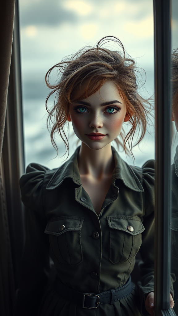 A hyperrealistic depiction of a woman with a bjd doll-like appearance, capturing a dark ambiance as she stands disheveled and furious. Her gorgeous features are juxtaposed with a touch of madness, her expression a mix of anger and absurdity, yet with a smooth smile that hints at a hidden, crazy charm. Her eyes gleam with a wild mix of pink and rainbow hues, reflecting a slightly absurd and chaotic world. Clad in a soldier-inspired dress that's both elegant and sloppy, she looks out the window, her expression shifting between surprise and embarrassment. The scene is highly detailed, the stunning environment outside showing hints of an old-painted world being engulfed by a storm. The image exudes ultra-realism, every detail finely captured, reminiscent of a photograph caught at the peak of an emotional tempest.