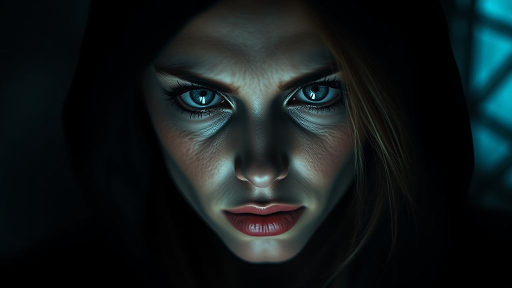 A hyperrealistic depiction of an enigmatic woman with striking glacier-blue eyes, enveloped in a shadowy aura, exuding an eerie presence. The scene is captured with subtle lighting, creating a haunting atmosphere. The composition employs a shallow depth of field, emphasizing the intricate details of her features against a dimly lit background, enhancing the mystique of her presence.