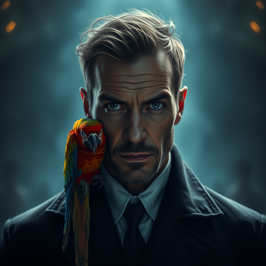 A hyperrealistic front shot of an enigmatic man with a brightly colored parrot perched on his shoulder, captured with a 50mm lens to emphasize intricate details, set against a backdrop of cinematic lighting that enhances the textures and contrasts within the scene, illustrating a sense of depth and vividness while maintaining the core essence of the original concept.