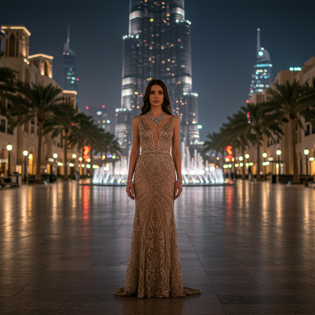 A hyperrealistic full-body portrait of a woman standing confidently in a town square in Dubai, captured with the exquisite Cinestill Hasselblad 50mm camera. She gazes directly at the camera, exuding grace and poise in a breathtaking haute couture ensemble. The distant fountain adds an enchanting background element, enhancing the scene's elegance. The composition follows the golden ratio, with soft, sophisticated lighting highlighting her detailed matte skin and intricate features. The analog-style photograph boasts 8k UHD quality with delicate film grain, achieving an unparalleled level of realism and detail. The overall atmosphere is glamorous, with a balanced, high-quality representation of beauty and style.