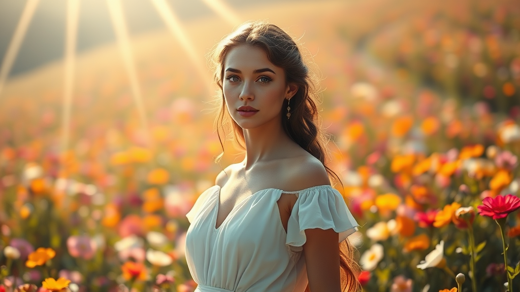 A hyperrealistic full-length portrait of a stunning goddess standing gracefully in a vibrant field filled with colorful flowers. Her exquisitely detailed and beautiful face is the centerpiece of the image, complemented by the elegance of a white sundress. Sunlight streams through, creating god rays that enhance the cinematic and intricate atmosphere of the scene. The character design is both elegant and realistic, embodying a concept art style with high detail in this digital painting. The depth of field adds to the realism, emphasizing the goddess's serene presence among nature.