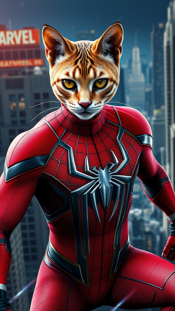 A hyperrealistic, high-detail marvel-inspired movie poster featuring a character with a cat head and an anthropomorphic humanoid body. The character is wearing a red suit reminiscent of Spider-Man's iconic costume, designed with intricate patterns and advanced materials that suggest an octane rendering style. The background displays a dramatic, action-packed cityscape with dynamic lighting, emphasizing the unique blend of feline features and superhero elements. The scene captures a sense of adventure and excitement, emphasizing the cat-like agility and prowess of the character. No human faces or traditional human elements are included, ensuring the focus remains on the fantastical and imaginative nature of the character design.