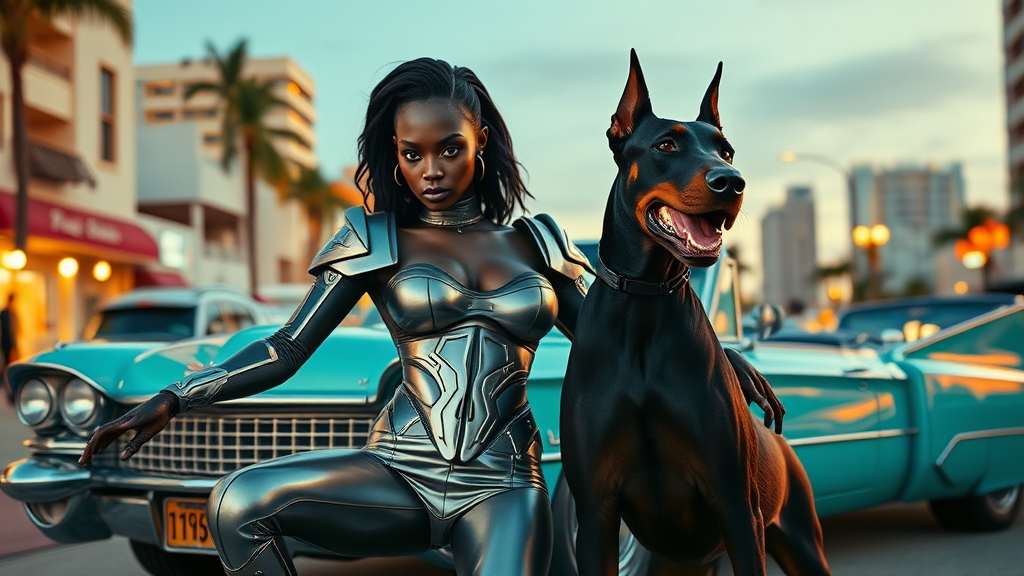 A hyperrealistic image features a figure with half the face of a black woman and half extraterrestrial, donning sleek, metallic futuristic armor-like clothing, striking a dynamic pose beside a vintage turquoise Cadillac. The setting is a vibrant Miami street at golden hour, casting warm hues across the scene. Two sleek black dobermans, muscles taut and alert, strain energetically towards the viewer, their powerful presence enhancing the electrifying atmosphere reminiscent of an avant-garde fashion photoshoot. The cityscape glows behind, blending past and future seamlessly.