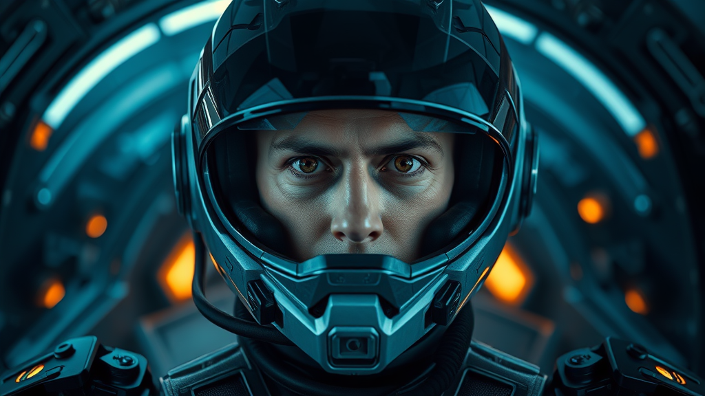 A hyperrealistic, intricately detailed portrait of a pilot wearing a futuristic, fully enclosed helmet, seated in an advanced sci-fi cockpit. Clad in hi-tech armor, the pilot's gaze is fixed intensely on the camera. The scene exudes a cyberpunk aesthetic, with bioluminescent elements softly illuminating the environment. The composition is centered, featuring cinematic depth of field and lighting that highlights the sharp focus on the pilot's expression and details, adding to the immersive futuristic atmosphere.