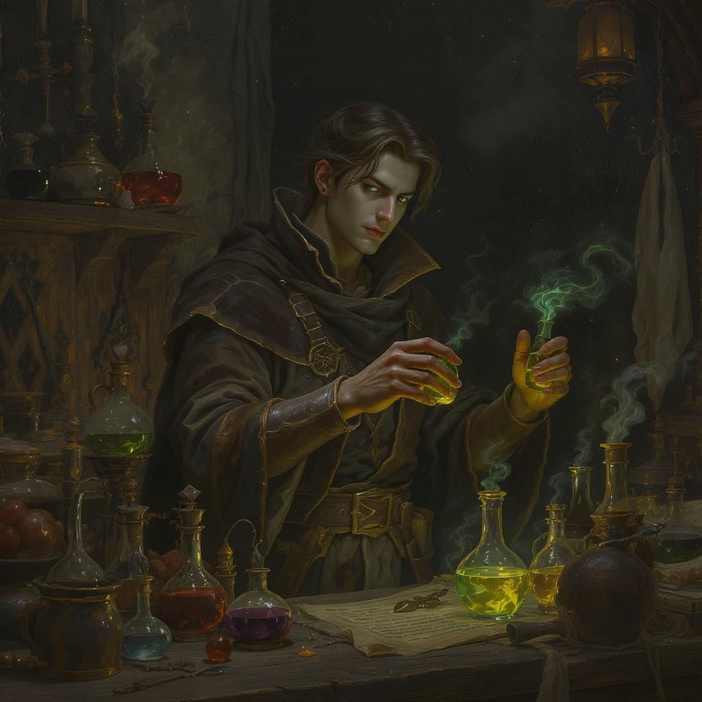 A hyperrealistic painting of a young male alchemist in a medieval lab, surrounded by an array of potions. The setting is dark fantasy, with intricate details in the background. The alchemist wears a detailed robe with subtle leather accents. The atmosphere is mysterious and intriguing, with an emphasis on the alchemist's focused expression and dexterous hands skillfully handling vials. While the scene is carefully crafted, it doesn't shy away from the imperfections of human creativity, embracing slight irregularities and subtle asymmetry in the character's features. The lab is filled with an assortment of medieval equipment, adding to the complexity of the composition. Despite minor artistic inconsistencies, the image captures the essence of a magical, immersive world.