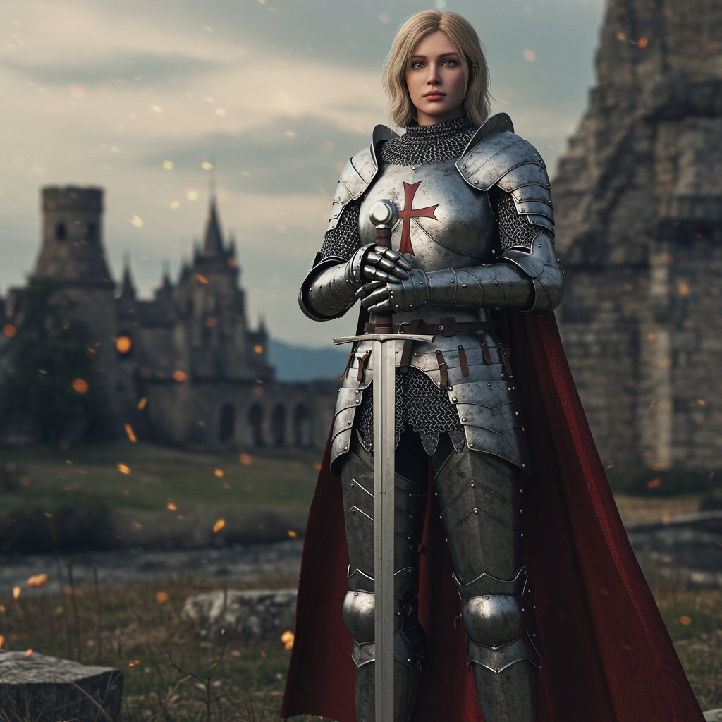 A hyperrealistic photo of a medieval fantasy female knight in intricately designed metal armor, combining elegance and strength, posed confidently with a sword. The scene is captured with cinematic lighting, emphasizing high-detail features and a focused depth of field. The image is shot in 8k resolution with an 85mm lens at f/1.4, highlighting the knight's determined expression and graceful stance. Surrounded by a backdrop of a medieval landscape, every detail of her armor shines in the light, portraying a blend of beauty and power. Attention to realism ensures accurate anatomy and proportions, with the environment enhancing the knight's valiant presence.
