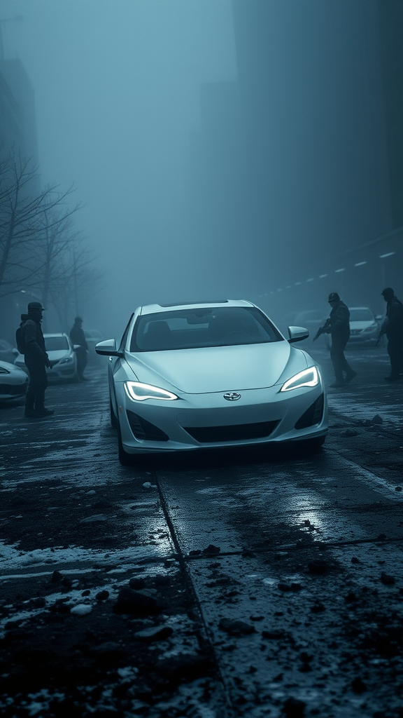 A hyperrealistic photo of a utopian car with sleek white paint set against the backdrop of a destroyed city. The scene is marked by high contrast and dense fog, evoking a reporter style ambiance. Snow and mud are scattered around, while the car's LED lights cut through the gloom. Crafted with superb materials, the low contrast atmosphere highlights the presence of soldiers on the ground. Captured from a top-level focal point, the bird’s eye view and drone perspective add depth. The image is reminiscent of an analog style, bringing an air of realism and intrigue. The matte skin and detailed textures create a soft lighting effect, with subsurface scattering adding dimension to the scene. Heavy shadows contribute to the masterpiece quality of this ultra-realistic 8k shot, adhering to the golden ratio for a balanced composition. Intricate and high-detail elements are presented through the lens of film photography, providing a large depth of field to encapsulate every nuance of this reimagined urban landscape.