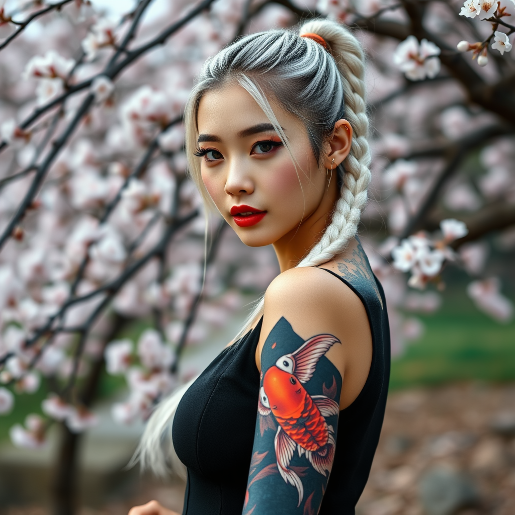 A hyperrealistic portrait of a breathtaking Korean K-pop idol with a striking white braided ponytail and a vibrant full sleeve koi fish tattoo, accentuated by red lips. The idol is posed confidently in a sleek, tight, all-black sleeveless dress, set against the serene backdrop of a cherry blossom landscape. Captured using a Canon R5 with a 200mm lens, the photograph features a sharp focus in ultra-high resolution, emphasizing the intricately detailed, lifelike texture of the idol's face. The image, shot in RAW format, showcases rich colors, dramatic and cinematic lighting, and hyper-realistic detail, making it a masterpiece of photorealism. The professional photograph is presented in 8k HD, with meticulous attention to realistic skin texture and high contrast, creating a stunning visual experience trending on Artstation. The scene exudes elegance and poise, embodying the spirit of beauty and grace, and is rendered in vibrant, ultra-high resolution for a truly immersive effect.