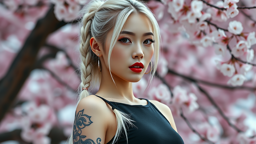 A hyperrealistic portrait of a captivating Korean kpop idol featuring a white braided ponytail and full sleeve tattoo. The idol has striking red lips and is dressed in a sleek all-black sleeveless bodysuit against a mesmerizing cherry blossom background. Captured with a Canon R5 utilizing a 200mm lens in sharp focus and RAW format, the image delivers an intricate, photorealistic, and highly detailed depiction with an 8k HD quality resolution. The photograph exhibits a rich and lifelike skin texture, enhanced by cinematic lighting and a vibrant color palette reminiscent of Kodak Portra 400 film. Rendered with physics-based techniques and embodying realistic digital artistry trends as seen on Artstation, the portrait stands out with its rich color depth and ultra-high resolution, making it a true masterpiece of photorealism.