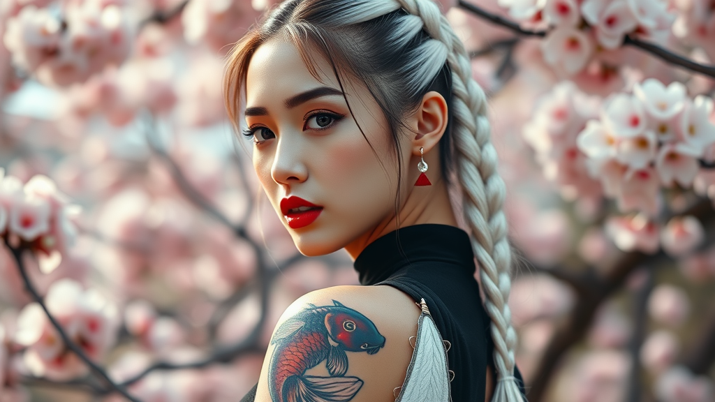 A hyperrealistic portrait of a captivating Korean K-pop idol with a sleek white braided ponytail and vibrant red lips. She sports a beautifully detailed full sleeve koi fish tattoo on her arm, complementing her chic tight all-black sleeveless dress. The scene is set against a magnificent backdrop of blooming cherry blossoms. Utilizing a Canon R5 with a 200mm lens, the shot is in sharp focus and captured in RAW format, highlighting an intricate and highly detailed face in stunning 8k HD quality. The image features rich, vivid colors with expert physics-based rendering and cinematic lighting, creating a photorealistic masterpiece. The photograph embodies exquisite realism with painstaking skin texture detail and lifelike precision, suitable for ultra high-resolution 8K wallpapers. Rich hues reminiscent of Kodak Portra 400 film enhance the dramatic lighting, all captured with the richness of a Nikon D850 perspective using an f1.6 lens, resulting in a truly lifelike digital art piece trending on Artstation.