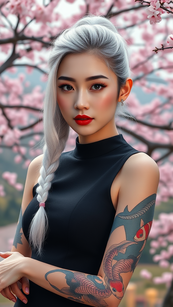 A hyperrealistic portrait of a captivating Korean K-pop idol with a striking white braided ponytail and full sleeve koi fish tattoo. She has bold red lips and is dressed in a form-fitting, all-black sleeveless dress. The background features a breathtaking cherry blossom landscape. The photograph is taken with a Canon R5 using a 200mm lens, with sharp focus in RAW format. The face is intricately detailed and captured in 8k HD quality. The image is a professional, high detail RAW color photo, featuring ultra high resolution, with rich colors and lifelike skin texture. The lighting is cinematic and dramatic, enhancing the realistic and photorealistic qualities desired in digital art trending on platforms like Artstation. The piece is characterized by its sharp clarity and best quality representation, reminiscent of film stock photographs with vivid color palettes. The rendering conveys a lifelike essence that is trending in photorealistic digital art circles.