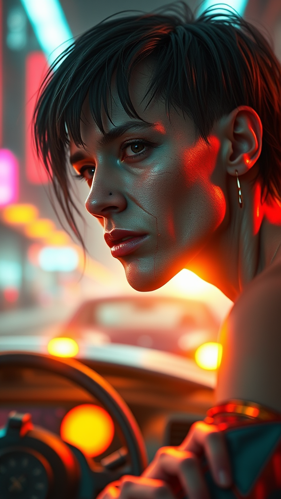 A hyperrealistic portrait of a futuristic character inspired by Blade Runner, featuring 8k ultra-realistic details with dramatic lens flare and atmospheric glow. The scene is rich in vibrant colors and cinematic lighting, capturing a sense of depth and artistry trending on platforms like ArtStation. Utilizing Unreal Engine 5, the artwork showcases intricate and extreme details, blending CGI techniques with 3D realism. The environment is stunningly rendered with Lumen reflections, highlighting a hyperrealistic car set in a vivid, cinematic world. Despite the high level of realism, there are subtle elements of disfigurement, with slightly distorted anatomy, extra arms and fingers, resulting in a unique, surreal masterpiece that plays with the boundaries of perception. The composition incorporates aspects of photography and CGI, creating an almost dreamlike quality, despite occasional blurry or fuzzy areas that contrast with the overall detailed focus.