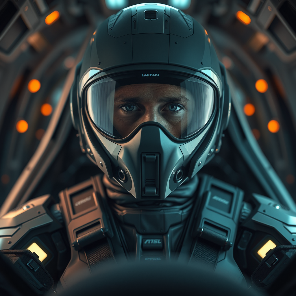 A hyperrealistic portrait of a pilot wearing a highly detailed, futuristic helmet that covers their entire face, sitting confidently in an advanced, high-tech cockpit. The pilot is dressed in sleek sci-fi armor that reflects the cyberpunk aesthetic, glowing with subtle bioluminescent accents. They gaze directly at the viewer, conveying a sense of determination and intensity. The composition is centered and designed with cinematic flair, featuring sharp focus, depth of field, and dramatic lighting that highlights the intricate textures and contours of the scene, capturing the essence of a futuristic voyage.