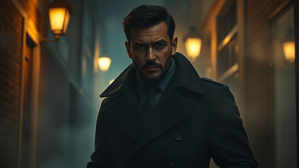 A hyperrealistic portrait of a rugged, overcoat-clad gang member inspired by Peaky Blinders, standing confidently in a dimly lit, smokey alley. The air is thick with haze and tension, illuminated by the faint glow of distant street lamps. The scene is rich in detail, capturing the grit of urban life, with a cinematic quality enhanced by subtle film grain. The atmosphere exudes an action-packed aura, with the individual's sharp gaze piercing through the smoke, suggesting a story of intrigue and danger lurking in the shadows.