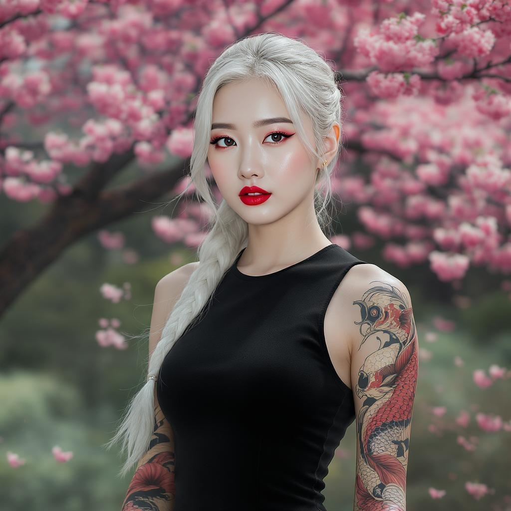 A hyperrealistic portrait of a striking Korean K-pop idol with a sleek white braided ponytail and vibrant red lips, adorned with a full sleeve tattoo of intricate koi fish. She stands gracefully in a dramatic cherry blossom landscape, wearing a form-fitting all-black sleeveless dress. Captured with a Canon R5, 200mm lens, the image is in sharp focus and shot in RAW format, showcasing an expertly detailed and lifelike face in stunning 8k HD quality. The portrait is characterized by ultra-high resolution and incredible detail, exhibiting a rich and lifelike skin texture. The scene is enhanced with cinematic lighting, offering a masterpiece of realistic digital art. The rendering is physics-based, delivering a photorealistic and vivid depiction with high contrast and lush colors akin to a Kodak Portra 400 film stock. The composition is influenced by trending digital art and photorealistic techniques reminiscent of those seen on Artstation. This seamless portrayal is free from any imperfections or distortions, ensuring a vivid and captivating viewing experience.