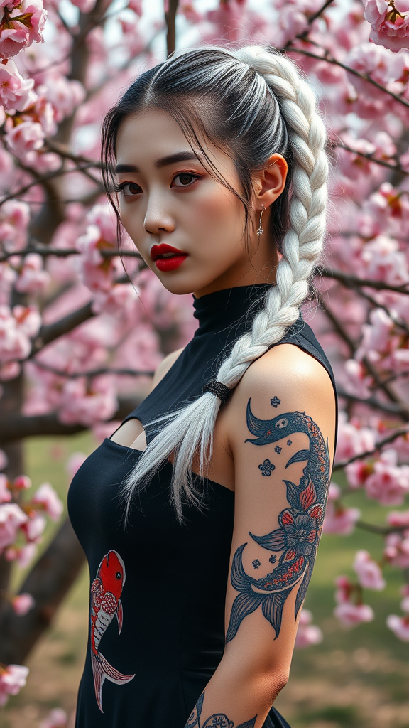 A hyperrealistic portrait of a stunning Korean K-pop idol with a sleek white braided ponytail and a full sleeve koi fish tattoo, complemented by bold red lips. She dons a chic, tight black sleeveless dress, standing amidst a vibrant cherry blossom landscape. Captured using a Canon R5 and a 200mm lens in sharp focus and RAW format, the photograph highlights an intricately detailed face, offering 8K HD quality. This image features ultra-high resolution with photorealistic digital art elements, showcasing realistic skin texture and lifelike details, captured under cinematic lighting conditions. The masterpiece blends realism with dramatic, rich colors, inspired by Nikon D850 and Kodak Portra 400 aesthetics. The scene is vibrant and filled with lush details, avoiding CGI, low quality artifacts, and maintaining anatomical accuracy, with no distortions or unintended artistic flaws.