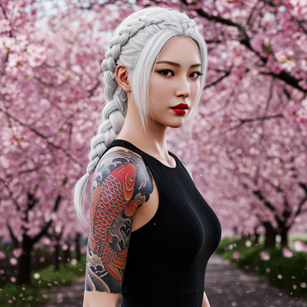 A hyperrealistic portrait of a stunning Korean K-pop idol with a white braided ponytail and a full sleeve koi fish tattoo, featuring red lips. She is wearing a sleek all-black sleeveless dress amidst a breathtaking cherry blossom landscape. Taken with a Canon R5 using a 200mm lens, this image is in sharp focus and shot in RAW format. The photograph displays an intricate, highly detailed face in 8k HD quality, capturing realistic skin texture and lifelike features. The scene uses physics-based rendering with cinematic lighting, resulting in a photorealistic masterpiece. Rich colors and dynamic contrast enhance the vividness of the image, trending on Artstation. Uniquely detailed and captured with a Nikon D850 film stock effect resembling Kodak Portra 400, the photo boasts rich colors and dramatic lighting. The hyper realistic lifelike texture reflects the best quality ultra high resolution, showcasing the idol's refined elegance against the delicate cherry blossoms.