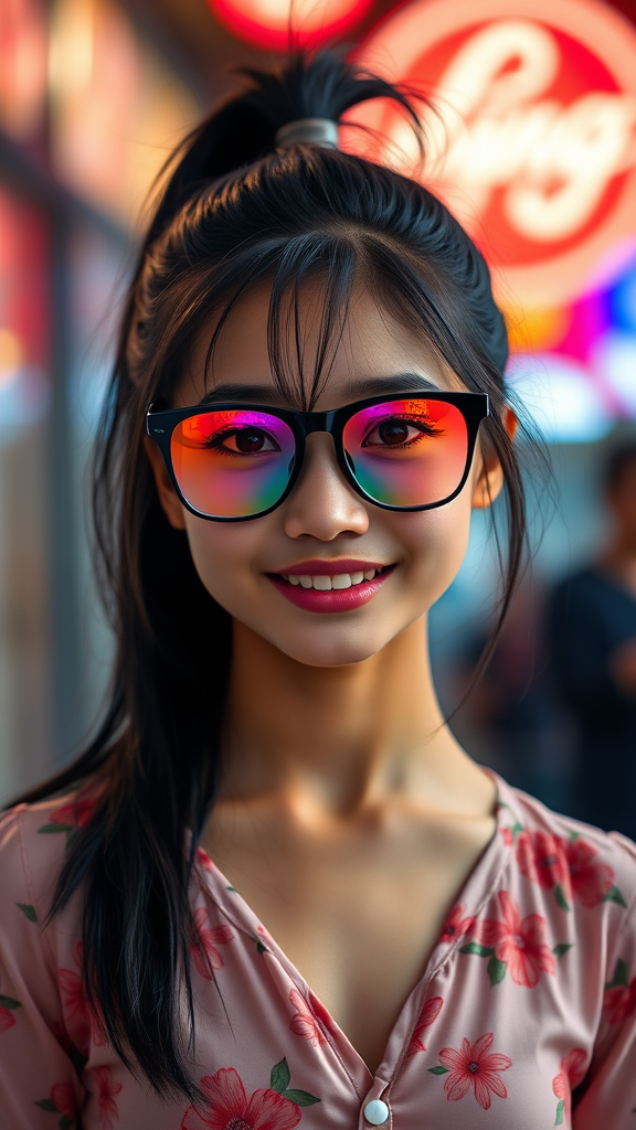 A hyperrealistic portrait of a young Southeast Asian girl with striking, medium-length black hair styled in a sleek ponytail. She faces the viewer with a friendly, inviting expression, her beautiful eyes accented by vibrant, colorful sunglasses. Her well-proportioned, toned body is adorned with a flowery blouse that hints at her personality. The scene is artfully lit with cinematic lighting, enhancing the intricate details of her face and outfit, set against a brightly lit background that adds a lively atmosphere. Inspired by the artistry of Greg Rutkowski and Magali Villanueve, this masterpiece captures the essence of youth and elegance.