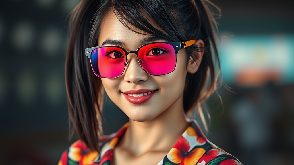 A hyperrealistic portrait of a young Southeast Asian woman with sleek medium-length black hair styled in a ponytail. Her friendly demeanor is captured through expressive, beautiful eyes accentuated by vibrant, colorful sunglasses. She poses confidently facing the viewer, showcasing a meticulously detailed face that reflects the artistic influences of Greg Rutkowski and Magali Villeneuve. Her toned body is adorned with a flowery shirt, adding a splash of color and elegance. The cinematic lighting casts a bright, captivating glow against the background, enhancing the intricate details that make this piece a true masterpiece in photography and artistry.