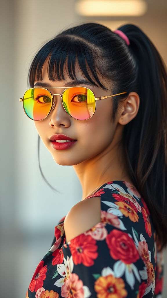 A hyperrealistic portrait of a young Southeast Asian girl with medium-length black hair. She's posing with her face turned towards the viewer, exuding a friendly demeanor. Her hair is styled in a sleek ponytail, accentuating her highly detailed features and captivating eyes. She's wearing vibrant and colorful sunglasses that complement her flowery shirt and toned physique. The lighting is cinematic, and she stands against a brightly lit background, creating a striking contrast. The image, inspired by the works of Greg Rutkowski and Magali Villeneuve, showcases intricate details and perfect proportions, capturing a moment of natural beauty and elegance.