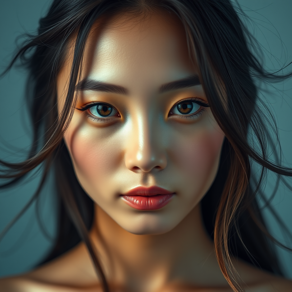 A hyperrealistic portrait of an Asian woman showcasing symmetrical beauty, with soft lighting highlighting her delicate skin texture and natural hues. Her bright, captivating eyes and flowing hair add dynamism to the image. Inspired by David LaChapelle, this shot emphasizes vibrant saturation and artistic flair, captured using a Canon EOS R5 mirrorless camera, with subtle creative enhancements to infuse an unexpected, surreal twist to the composition.