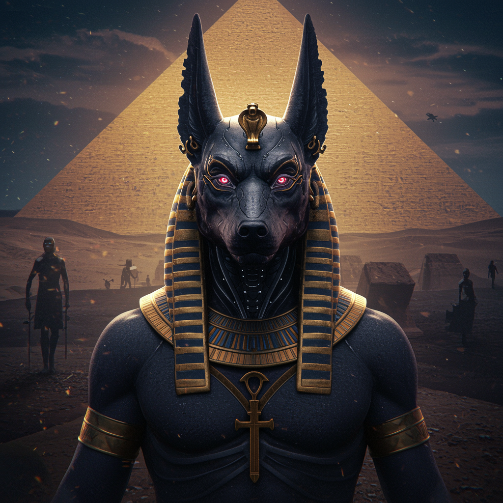 A hyperrealistic portrait of an Egyptian male Anubis in a cyberpunk style, featuring intricate details and hyperdetailed eyes. Set against the backdrop of a mysterious pyramid, the artwork embodies a dark fantasy vibe with a matte painting technique reminiscent of a masterwork by Greg Rutkowski. The scene is illuminated with dynamic lighting, showcasing an eldritch, hyperdetailed aesthetic. The character is depicted with a commanding presence, avoiding any poorly drawn elements or anatomical inaccuracies. The composition is clear and centered, ensuring high-quality presentation in 8k resolution without any digital artifacts or distractions. The style is unique and distinct, focusing on the powerful and enigmatic essence of Anubis within a futuristic, cyberpunk world.