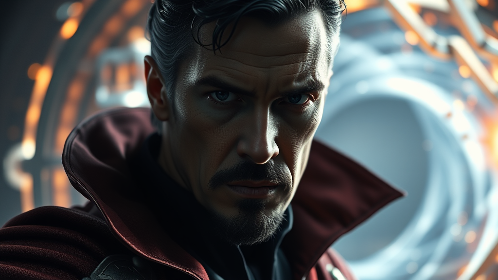 A hyperrealistic portrait of Doctor Strange featuring cinematic lighting, 8k detail, capturing a stoic expression with a soft blur effect; a swirling, mystical portal opens in the background, casting ethereal light and shadows; rendered with the precision of Unreal Engine, adding a surreal yet lifelike quality to the scene.