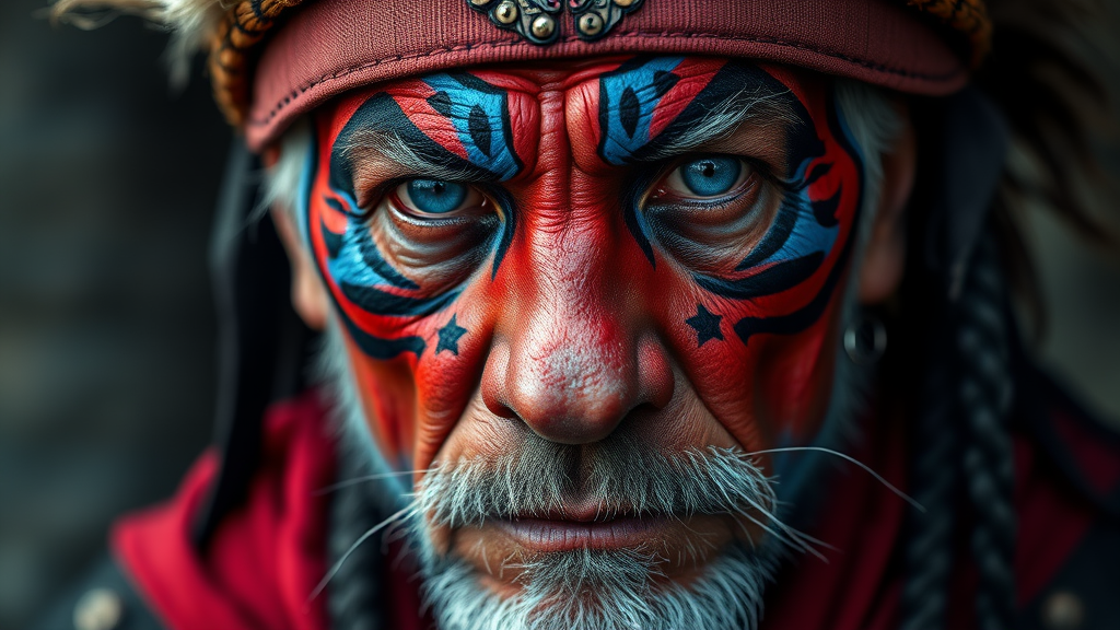 A hyperrealistic portrait photo of an elderly Austrian warrior chief, adorned with tribal panther makeup in striking shades of blue on red. Captured from a front profile, the image showcases the intricate texture and detail of his aged skin. His serious eyes stare intently at the camera, emphasizing his commanding presence. Shot with a 50mm f2 lens, the photo employs hard rim lighting to accentuate his features, utilizing a gfx100 camera for exceptional detail, while the background subtly blurs out, focusing attention on the warrior's dignified and resolute expression.