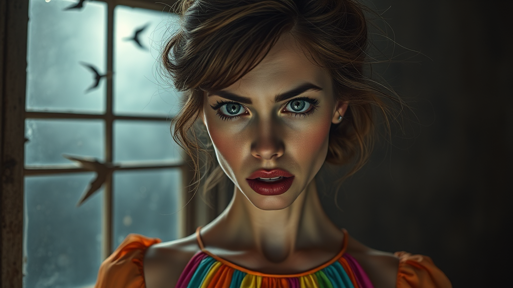 A hyperrealistic portrayal of a woman with features reminiscent of a BJDDoll, set in a dark, moody ambiance. Her expression is a mix of fury and surprise, with disheveled hair framing her gorgeous yet slightly crazy demeanor. Her smooth skin contrasts sharply with a bright, rainbow-hued dress that seems both absurd and captivating. In the background, a storm rages outside an old, weathered window, casting an intriguing light into the room. Despite the chaos, she stands like a soldier, exuding strength yet seemingly embarrassed by her own unexpected emotions. The scene is captured with ultra-realistic detail, emphasizing the highly textured environment, the subtle interplay of light, and the striking beauty of the moment.