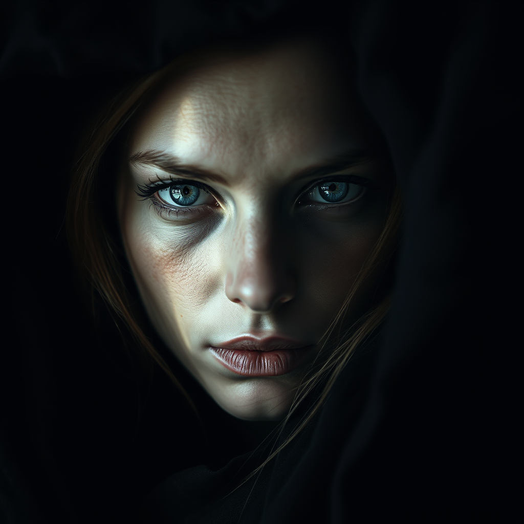 A hyperrealistic portrayal of an enigmatic woman possessing intensely captivating glacier blue eyes, enveloped in an otherworldly, shadowy aura. Her haunting presence is captured with minimal lighting that accentuates the darkness surrounding her, inviting intrigue. The scene is crafted with a striking depth of field, highlighting the highly detailed textures of her features and attire. Subtle light plays across her face, adding an air of mystique.