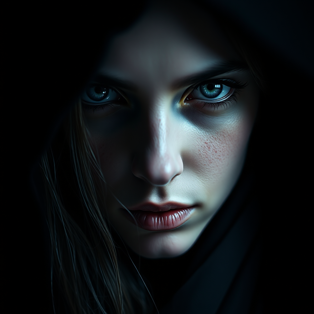 A hyperrealistic portrayal of an enigmatic woman with intense glacier blue eyes, enveloped in an enigmatic aura, haunting presence, bathed in subtle, minimal lighting, surrounded by shadowy darkness, intricate detail throughout, with a captivating depth of field.