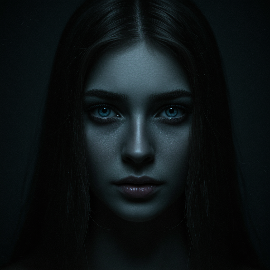 A hyperrealistic portrayal of an enigmatic woman with intense glacier blue eyes, enveloped in an ominous aura, evoking a haunting presence, with subtle, minimal lighting casting deep shadows, showcasing a rich depth of field, intricately detailed, capturing her ethereal and unfathomable essence.