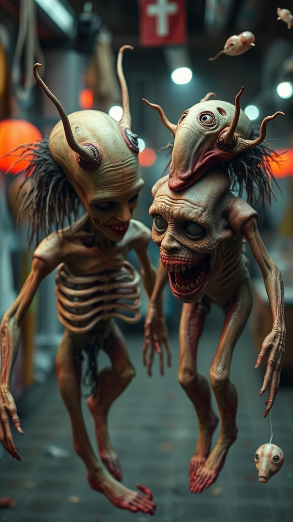 A hyperrealistic professional color photo capturing a cinematic scene with vibrant lighting and meticulous attention to photorealism. The image boasts exceptional detail with raytracing effects and a pronounced depth of field, reminiscent of AD Magazine Photography. In contrast, elements of disarray are introduced with poorly rendered anatomy, featuring incorrect proportions, extra and missing limbs, disconnected appendages, floating elements, and peculiar mutations. The scene conveys an unsettling and distorted beauty, blending the line between captivating and grotesque, with an intentional blur adding to the chaotic aesthetic.