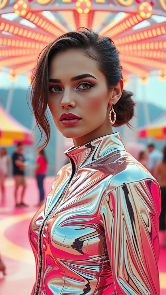 A hyperrealistic retrofuturistic portrait of a woman at a vibrant world circus, rendered in cinematic ultra HD, capturing the surreal essence of futuristic fashion inspired by Marc Jacobs. She stands poised in a striking chrome outfit, set against a dreamlike landscape. The scene is infused with the aesthetic of a 90's fashion magazine photoshoot, utilizing a medium format camera and shot on Fuji Superia 400 film at ISO 400. Her face, among the most beautiful in the world, is artfully framed, exuding an enigmatic allure. This image balances realism with surrealism, evoking a nostalgic yet forward-looking vision, captured through the clarity of a 35mm lens and brought to life with a surreal engine in vivid ProPhoto RGB color space.