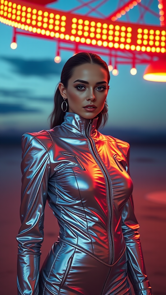 A hyperrealistic retrofuturistic portrait of a woman at a world circus, featuring octane render and realistic CGI in ProPhoto RGB. The scene is powered by a surreal engine using a 35mm lens, presenting in Ultra HD. It's a Marc Jacobs fashion magazine photoshoot showcasing futuristic fashion, focusing on the most beautiful faces in the world. The female subject poses in a shimmering chrome outfit against a surreal landscape backdrop. The photograph combines elements of 90's fashion style, captured on medium format film using Fuji Superia 400 at ISO 400. The overall ambiance is cinematic and surrealistic, rendered in stunning 8k resolution.