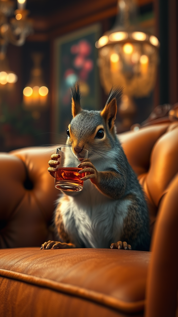 A hyperrealistic scene of a squirrel perched comfortably on a lavish sofa at an opulent party, sipping whisky from a tiny glass with an elegant paw. The intricate fur details shimmer under the ambient lighting, capturing the alive essence of the lively background. The setting is rich with textures, showcasing an 8k photorealism in a 16:9 aspect ratio, where every element from the delicate wood grain of the sofa to the subtle reflections in the whisky glass is masterfully rendered.