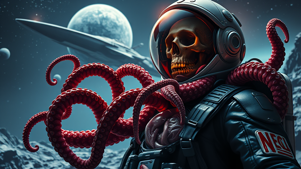A hyperrealistic, ultra-HD image of a space explorer with intricate and superfine details, showcasing tentacles intertwined with exposed internal organs under an alien sky. The spaceship looms in the background, its sleek design contrasting with the unsettling organic texture of the scene. Drool glistens on the explorer's suit, captured in stunning 8K clarity, highlighting the surreal blend of sci-fi and biological elements. The overall atmosphere is both mesmerizing and otherworldly, inviting viewers to explore the depths of this beautifully detailed extraterrestrial landscape.